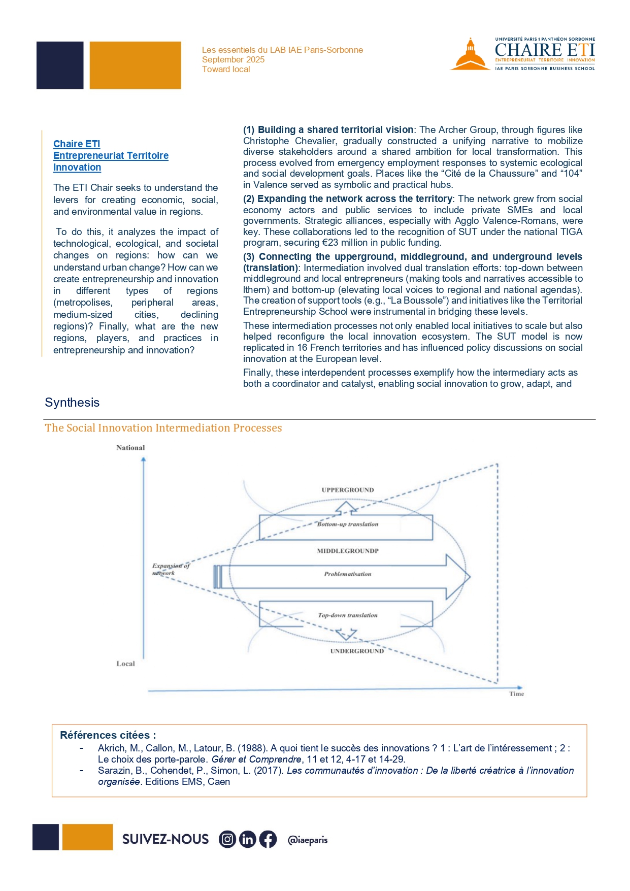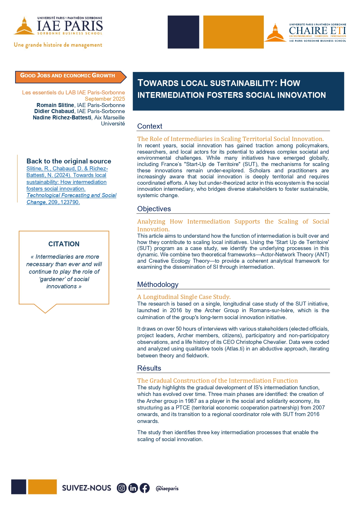 With LAB Essentials, we'd like to regularly share with you the results of scientific research at the LAB IAE Paris-Sorbonne. On the program for this edition as part of the Entrepreneuriat Territoire Innovation (ETI) Chair: "Towards local sustainability: how intermediation fosters social innovation" by Romain Slitine, Researcher and Didier Chabaud, Professor at The Sorbonne Business School as well as Nadine Richez-Battesti, Professor at Aix Marseille université.