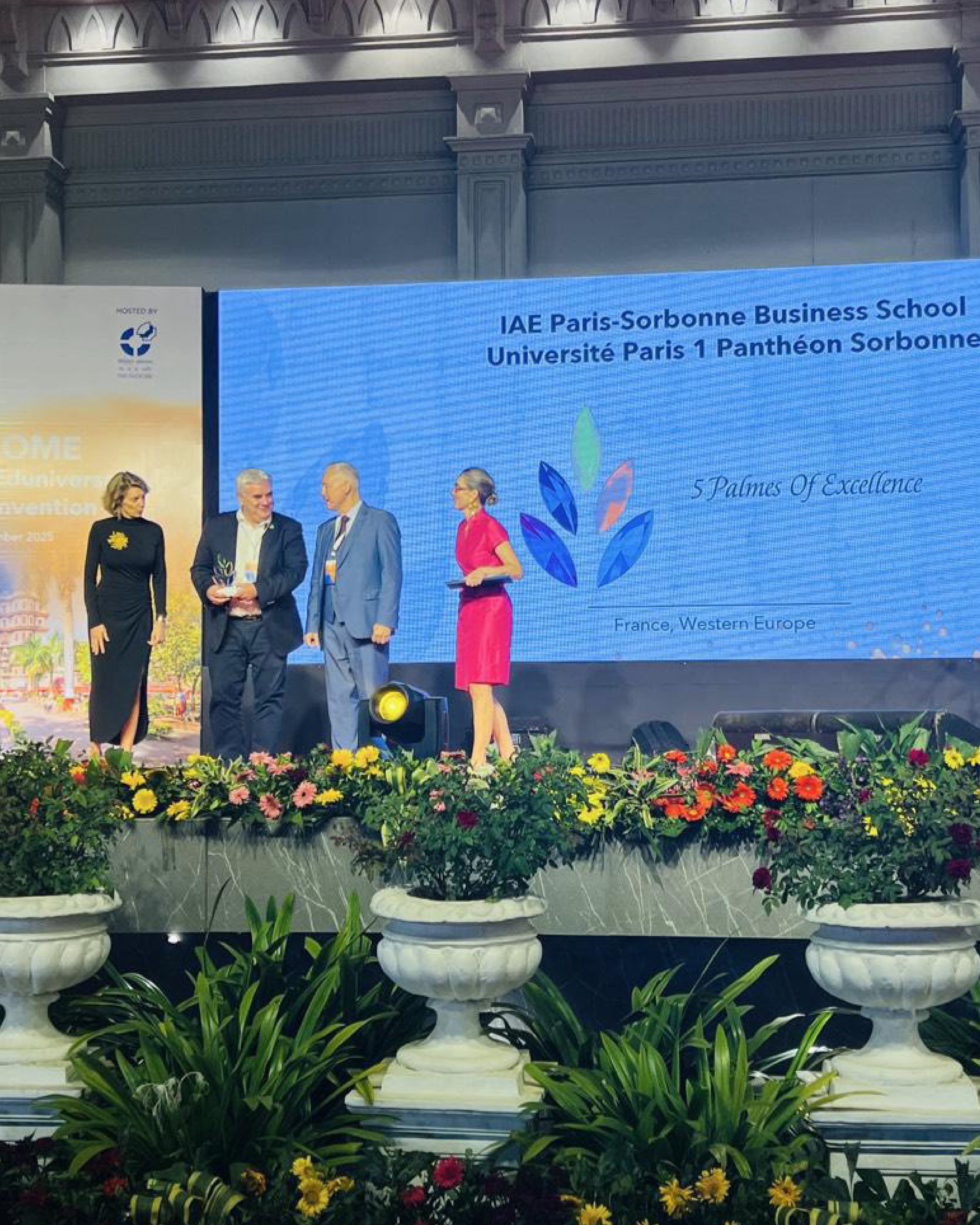 L'IAE Paris-Sorbonne, représenté par son directeur Eric LAMARQUE, a reçu officiellement son trophée « 5 Palmes d’Excellence » lors de la 18e Convention mondiale d’Eduniversal qui s'est tenue du 10 au 13 novembre 2025 à Indore en Inde et qui a rassemblé des doyens et des leaders universitaires du monde entier.