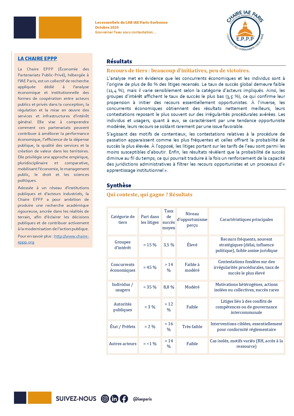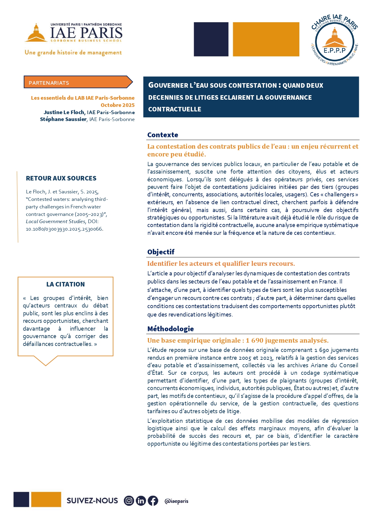 Avec les essentiels du LAB, nous souhaitons vous partager régulièrement les résultats de recherche scientifique du LAB IAE Paris-Sorbonne. Au programme pour cette édition : “Gouverner l'eau sous contestation : quand deux décennies de litiges éclairent la gouvernance contractuelle” par Stéphane Saussier, Professeur et Justine Le Floch, Doctorante à l'IAE Paris-Sorbonne dans le cadre de la Chaire Économie des Partenariats Public-Privé.