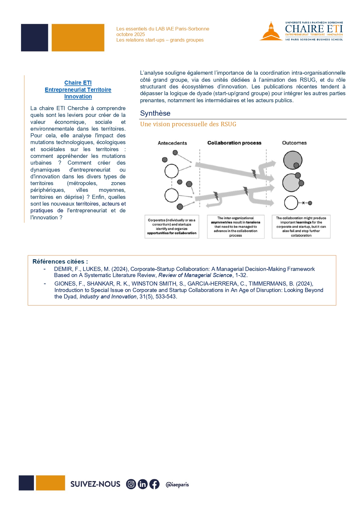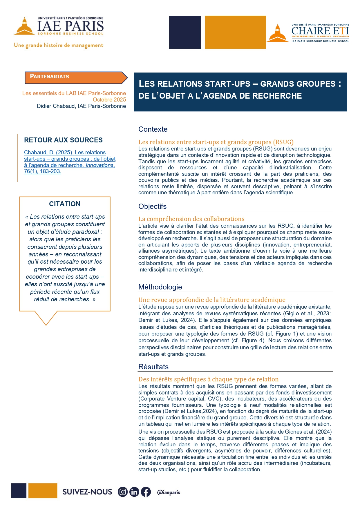 Avec les essentiels du LAB, nous souhaitons vous partager régulièrement les résultats de recherche scientifique du LAB IAE Paris-Sorbonne. Au programme pour cette édition dans le cadre de la Chaire Entrepreneuriat Territoire Innovation (ETI) : “Les relations entre start-ups - grands groupes : de l'objet à l'agenda de recherche” par Didier Chabaud, Professeur à l'IAE Paris-Sorbonne.