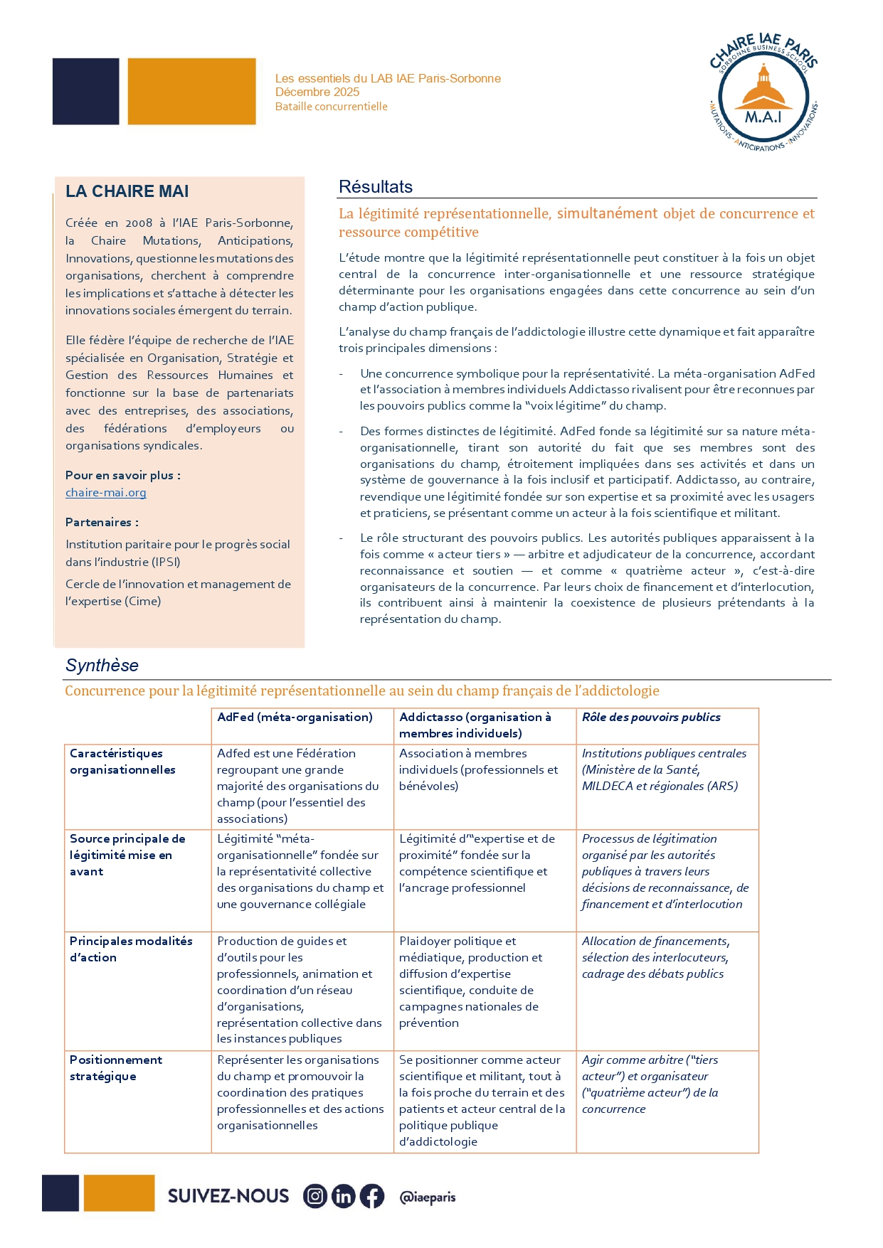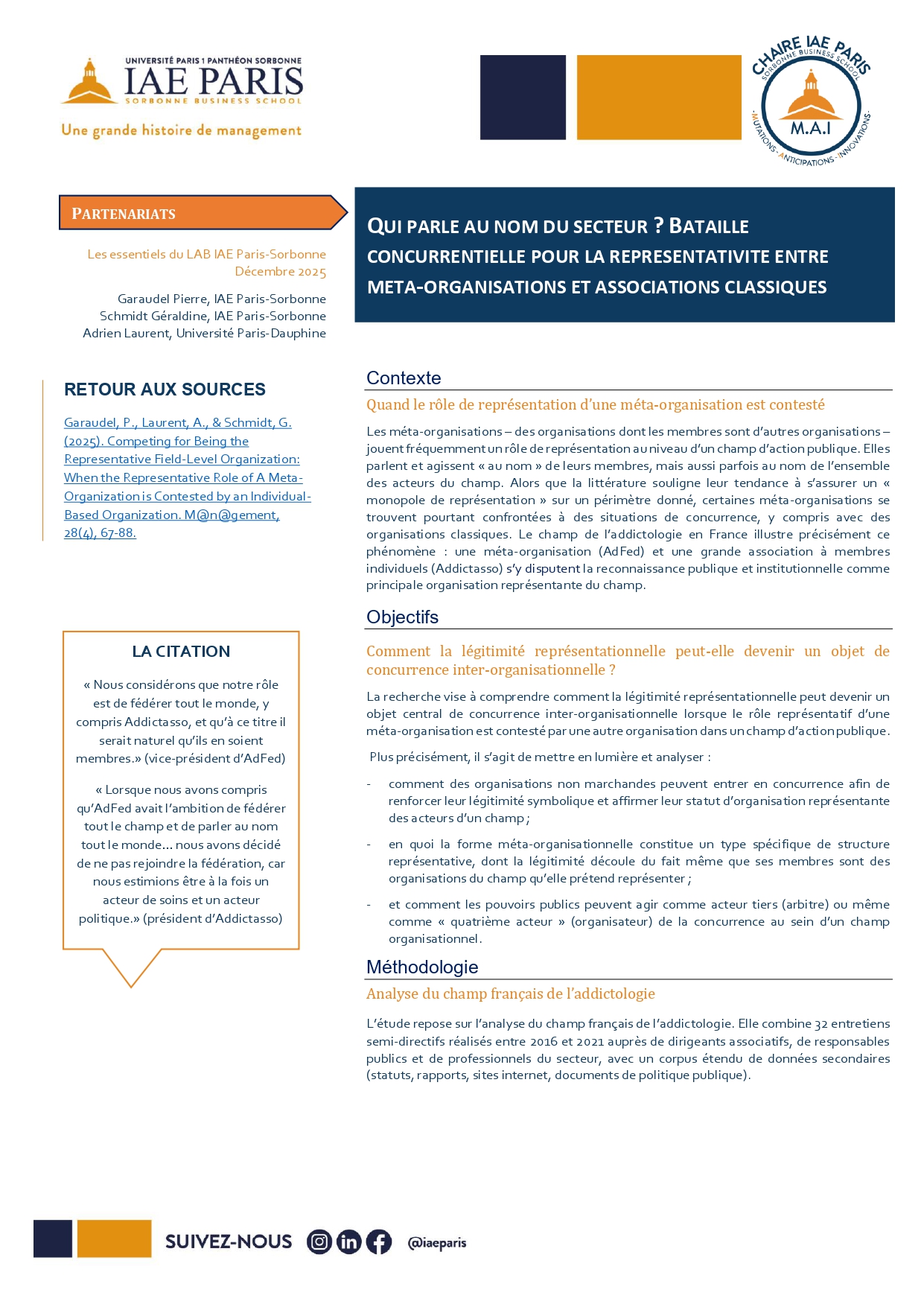 Avec les essentiels du LAB, nous souhaitons vous partager régulièrement les résultats de recherche scientifique du LAB IAE Paris-Sorbonne. Au programme pour cette édition : “Qui parle au nom du secteur ? Bataille concurrentielle pour la représentativité entre méta-organisations et associations classiques” par Pierre Garaudel, Maître de conférences HDR, Géraldine Schmidt, Professeure à l'IAE Paris-Sorbonne et Adrien Laurent, Maître de conférence à l'université Paris Dauphine dans le cadre de la Chaire Mutations Anticipations Innovations (MAI).