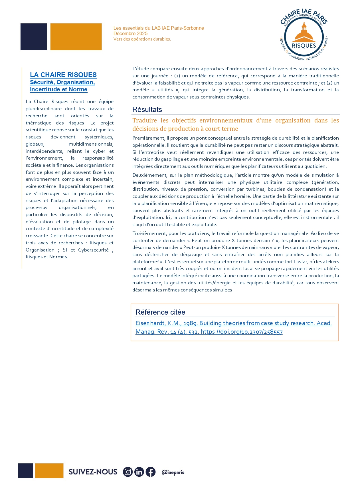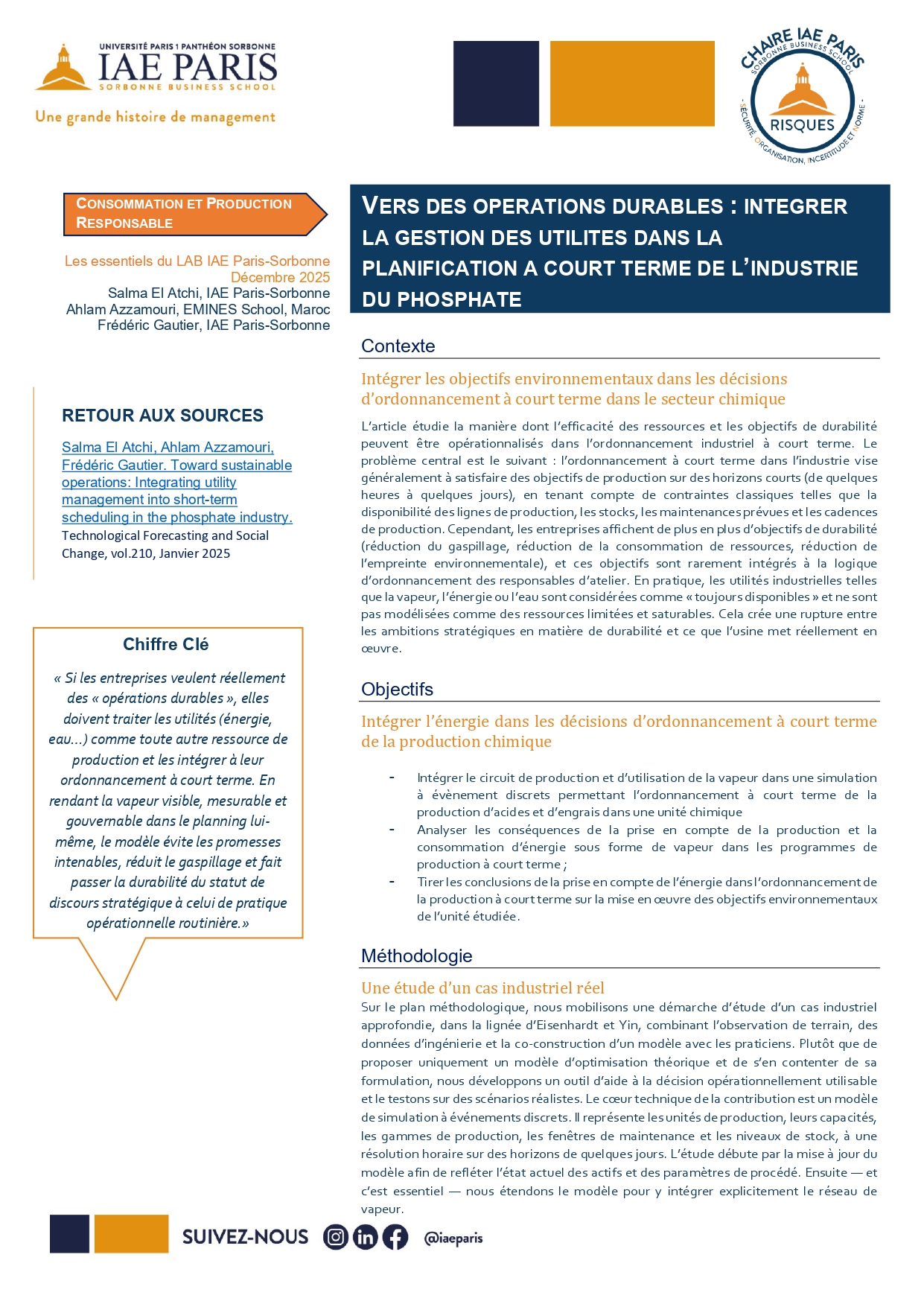 Avec les essentiels du LAB, nous souhaitons vous partager régulièrement les résultats de recherche scientifique du LAB IAE Paris-Sorbonne. Au programme pour cette édition : “Vers des opérations durables : intégrer la gestion des utilités dans la planification à court terme de l'industrie du phosphate” par Salma El Atchi, Doctorante et Frédéric Gautier, Professeur à l'IAE Paris-Sorbonne ainsi que Ahlam Azzamouri, Enseignant-chercheur à l'EMINES School au Maroc dans le cadre de la Chaire Risques.